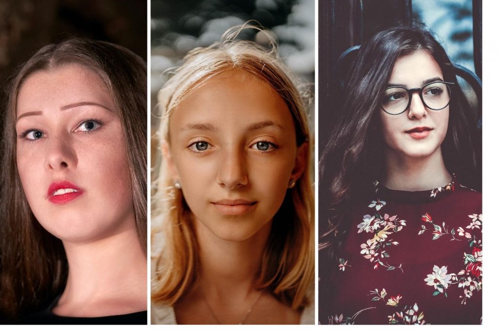 Beispiel: Hier ein Gesicht mit viel (links) und eines mit weniger Fläche (mitte). Die Frau mit dem Blumenkleid (rechts)wiederholt mit dem Abstand zwischen den Blumen ihre Fläche im Gesicht. Wären die Blumen dicht an dicht gesetzt, gäbe es keine Harmonie.