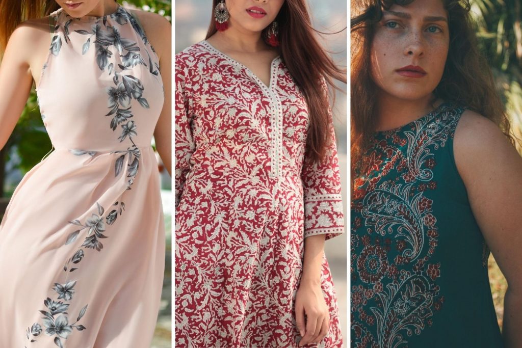 - Betonen Sie eher die vertikale als die horizontale Linie. Gerade wer eine größere Kleidergröße trägt, könnte auf Mittelbetonung achten, wie die Blumenranke oder die verlängerte Ausschnittborte (Bild links und mitte).